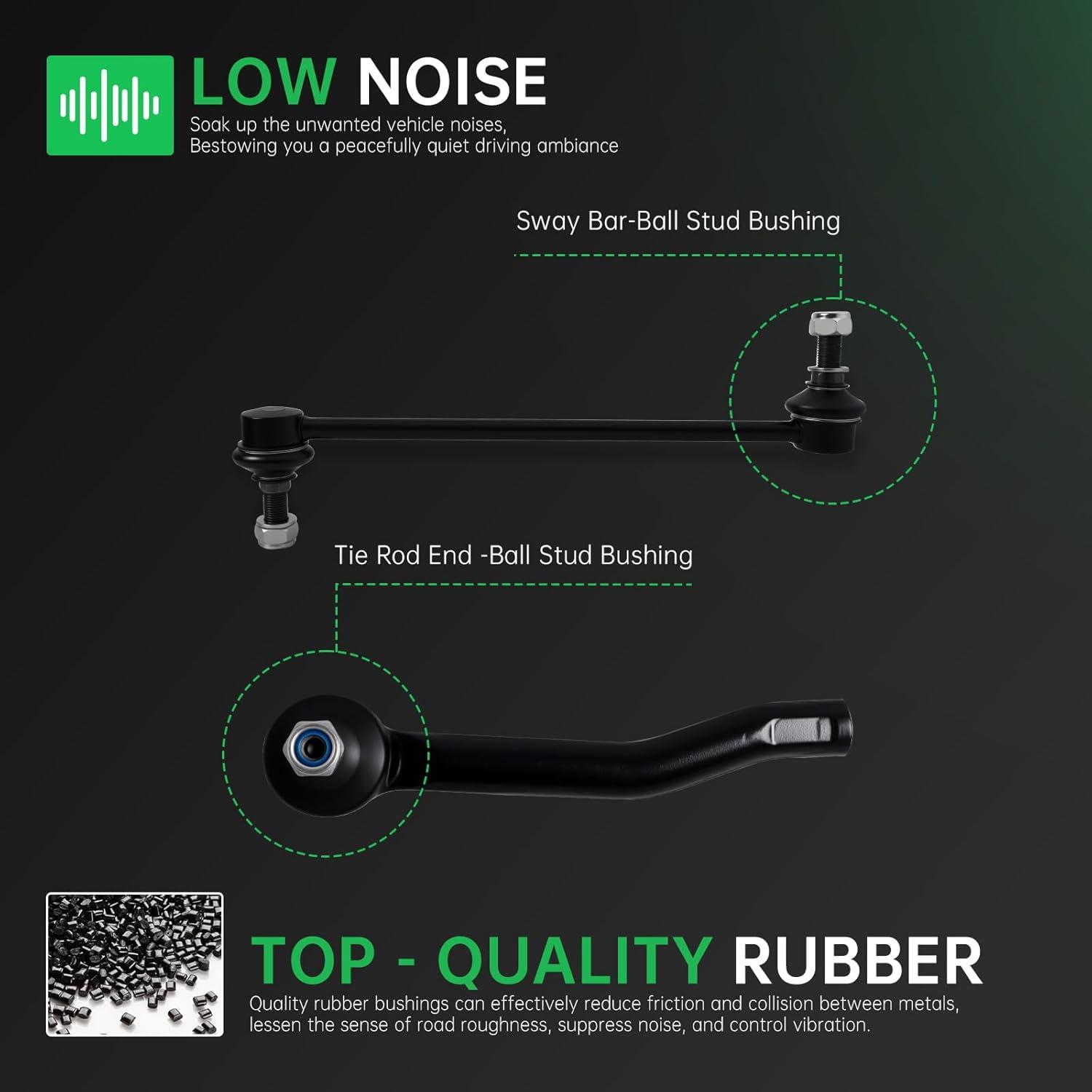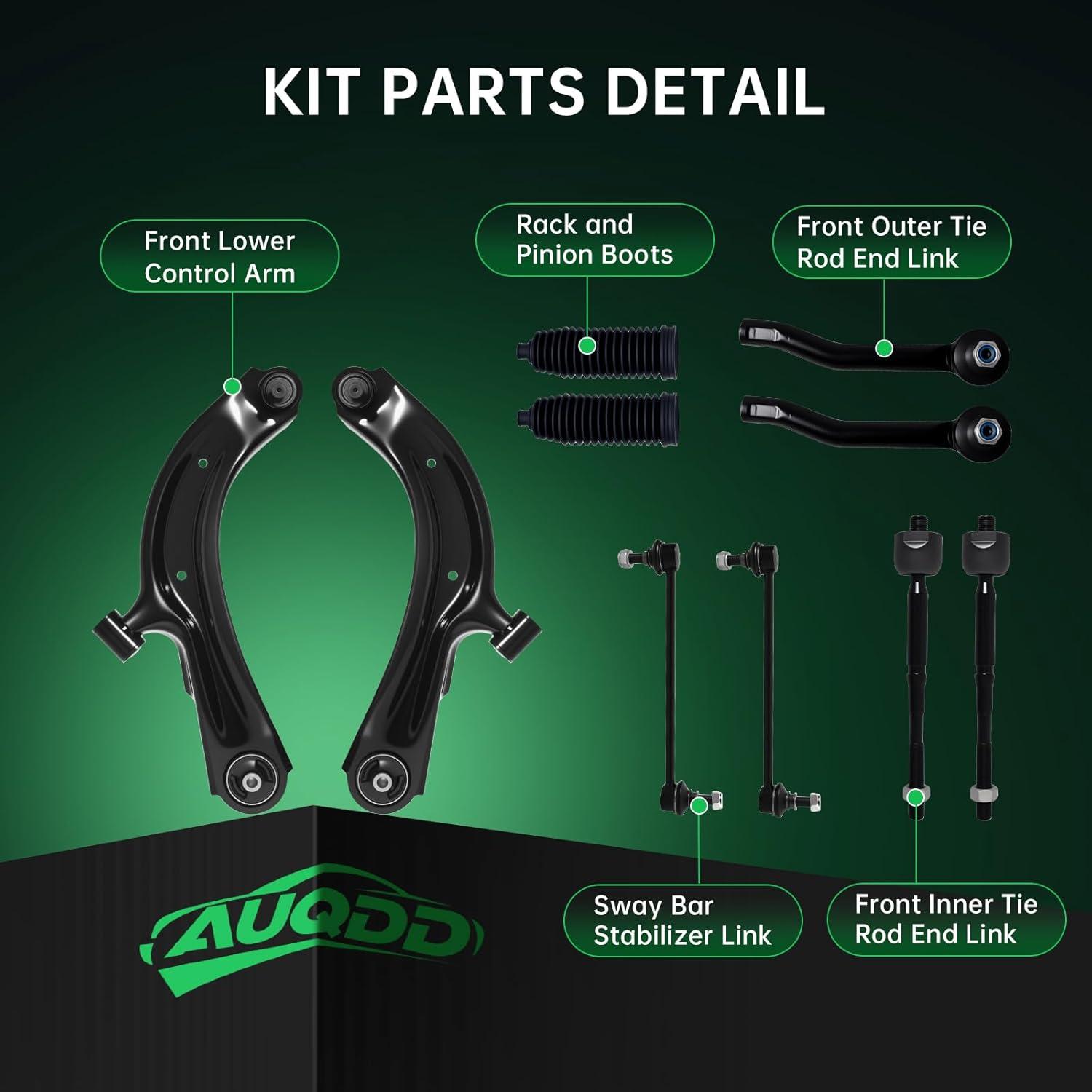 【Suspension Kit Include】 2 x Front Lower Control Arm w/Ball Joint Assembly – ( K622159 + K622160 ) Driver & Passenger Side, 2 x Front Outer Tie Rod End Links – ( ES800965 + ES800966 ), 2 x Front Inner Tie Rod End Links – EV800951, 2 x Front Stabilizer Sway Bar End Links – K750719 , 2 x Rack and Pinion Boots
