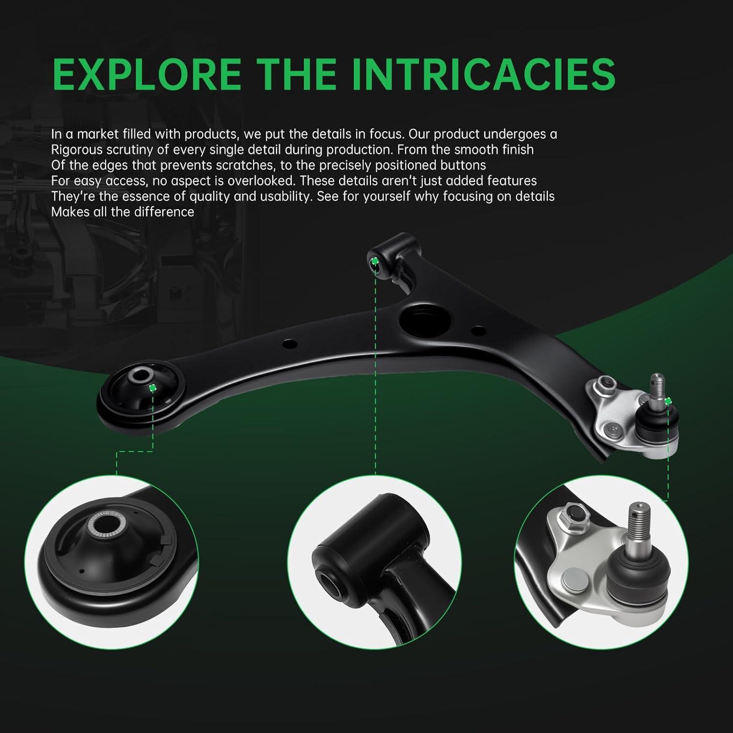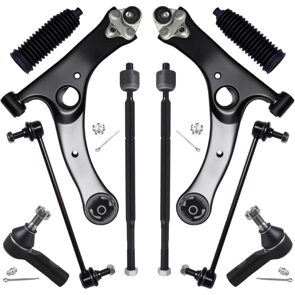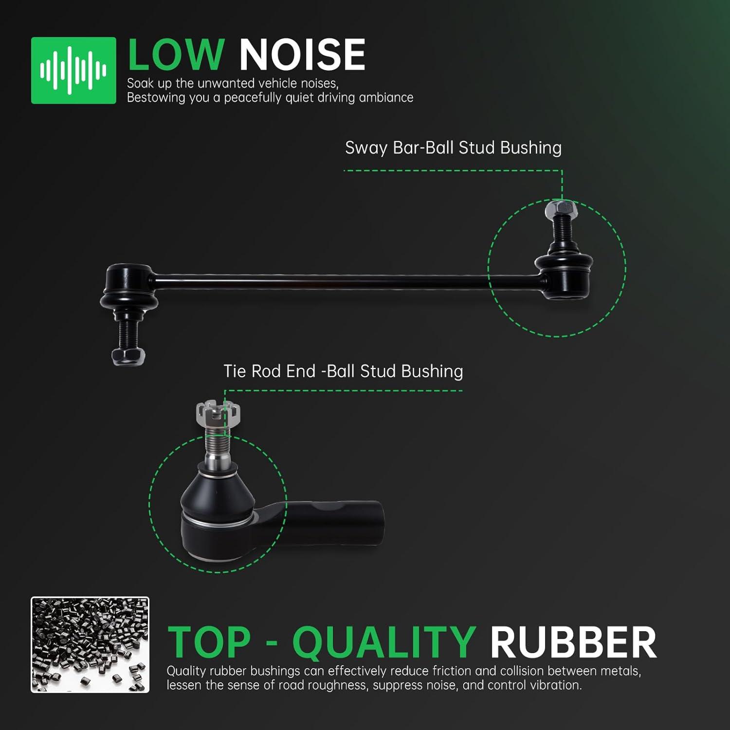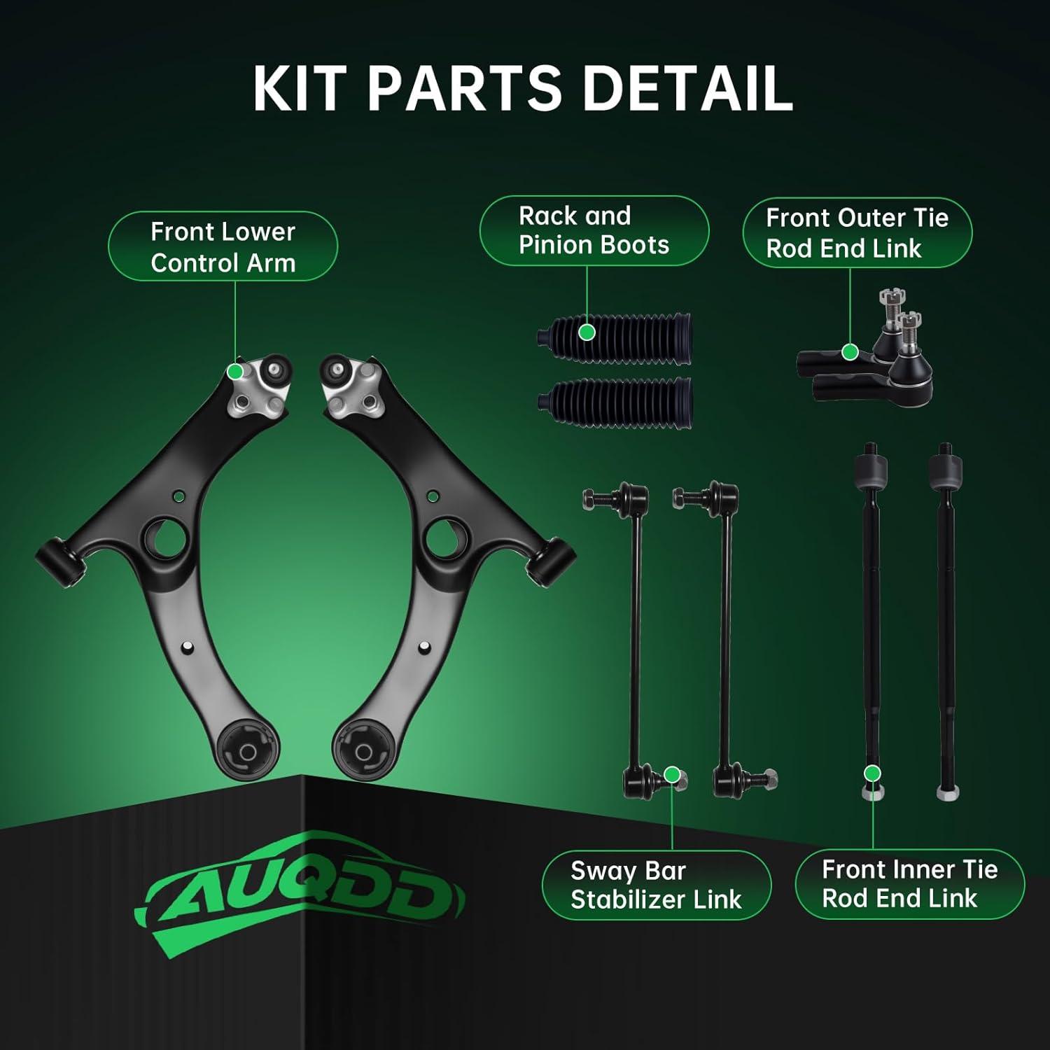 【Suspension Kit Include】 2 x Front Lower Control Arm w/Ball Joint Assembly – ( K640360 + K640361 w/K500175 ) Driver & Passenger Side, 2 x Front Outer Tie Rod End Links – ES3713, 2 x Front Inner Tie Rod End Links – EV466, 2 x Front Stabilizer Sway Bar End Links – K80230 , 2 x Rack and Pinion Boots