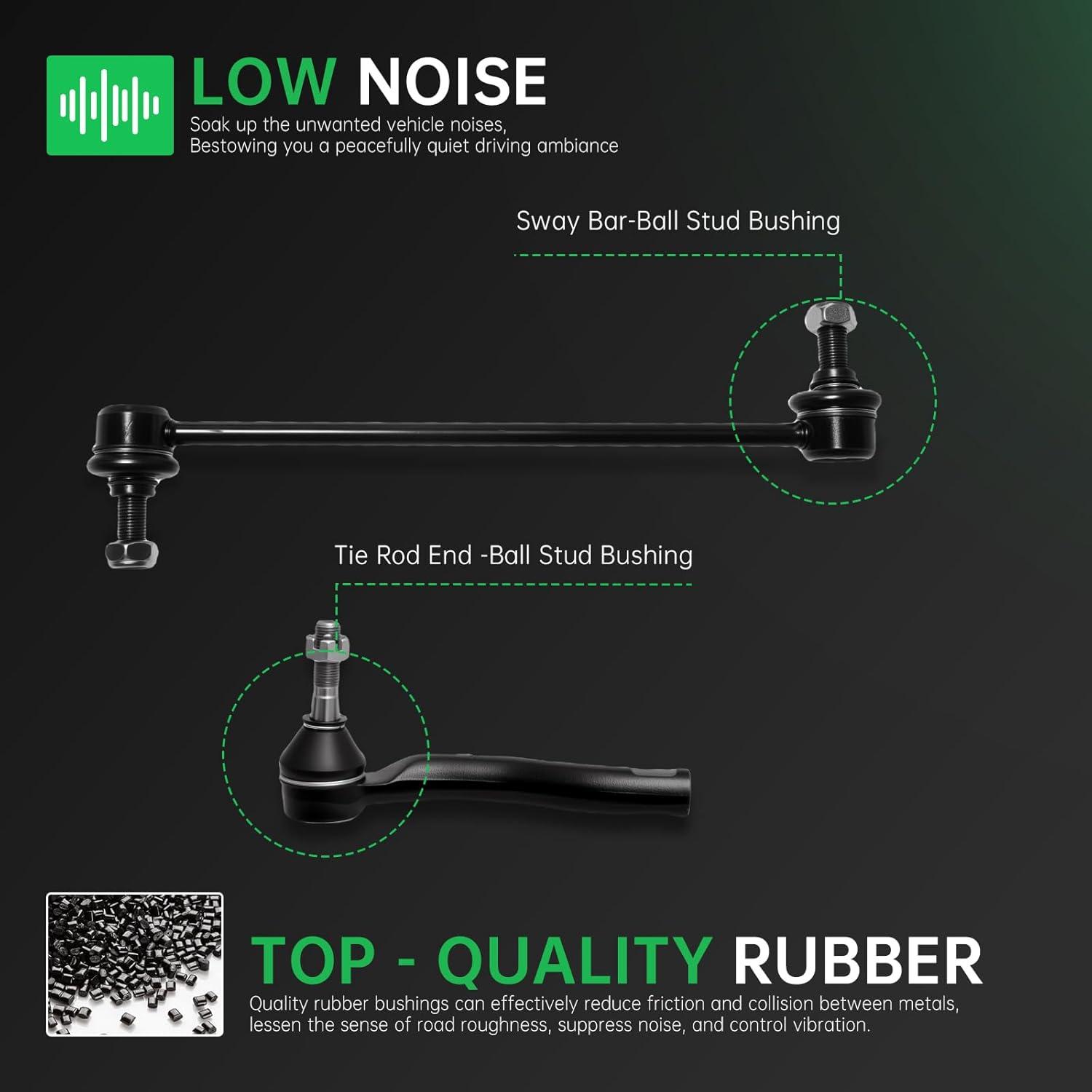 【Suspension Kit Include】 2 x Front Lower Control Arm w/Ball Joint Assembly – ( MS861128 + MS861129 ) Driver & Passenger Side, 2 x Front Outer Tie Rod End Links – ( ES80302 + ES80303 ), 2 x Front Inner Tie Rod End Links – EV80304, 2 x Front Stabilizer Sway Bar End Links – K80230, 2 x Rack and Pinion Boots.