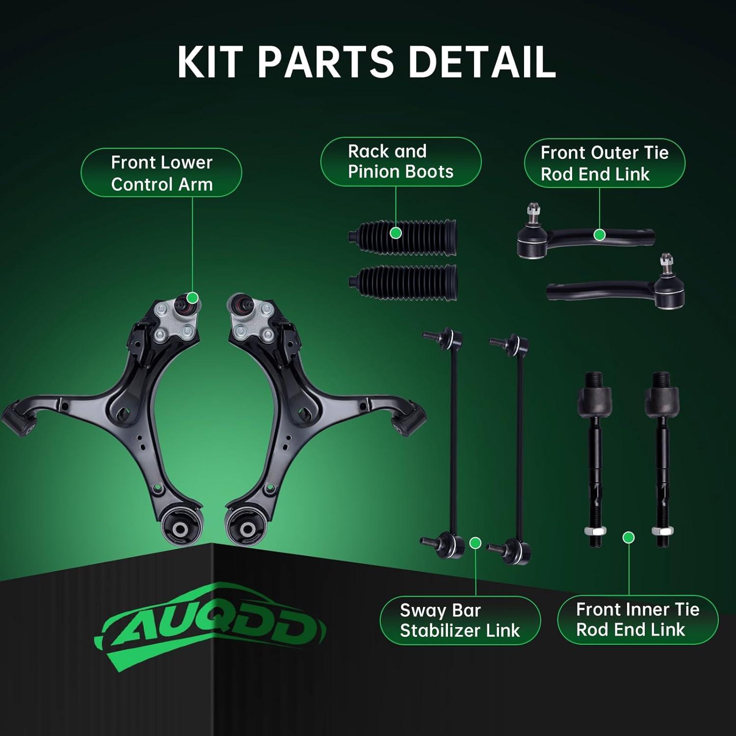 AUQDD 10Pc Front End Suspension Kit Fit For 2012-2015 Ho-nda Civic /13-15 Ac-ura ILX, 2 Lower Control Arm w/Ball Joint 2 Sway Bar Link 4 Outer & Inner Tie Rod End (# 520-695 K750605 EV800906 ES800912)