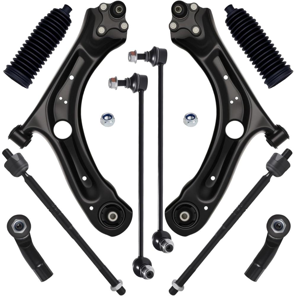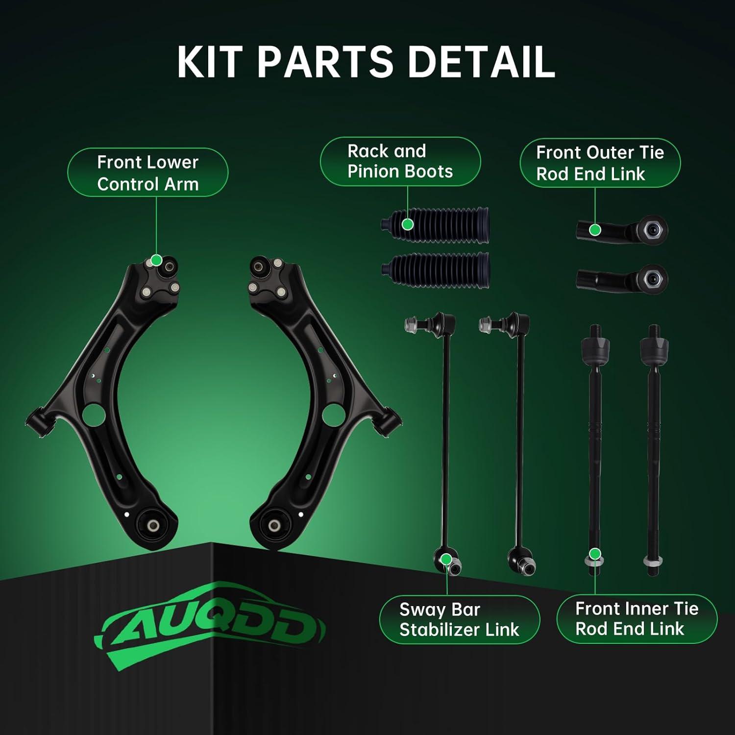 【Suspension Kit Include】 2 x Front Lower Control Arm w/Ball Joint Assembly – ( 522-837 + 522-838 ) Driver & Passenger Side, 2 x Front Outer Tie Rod End Links – ( ES80666 + ES80667 ), 2 x Front Inner Tie Rod End Links – EV800899, 2 x Front Stabilizer Sway Bar End Links – K80478 , 2 x Rack and Pinion Boots