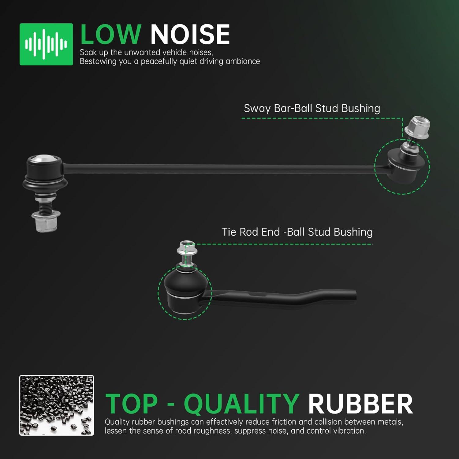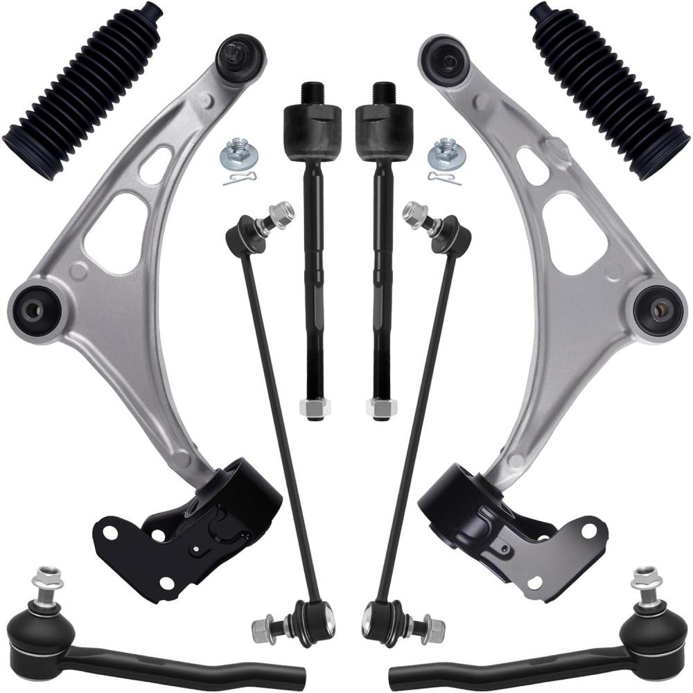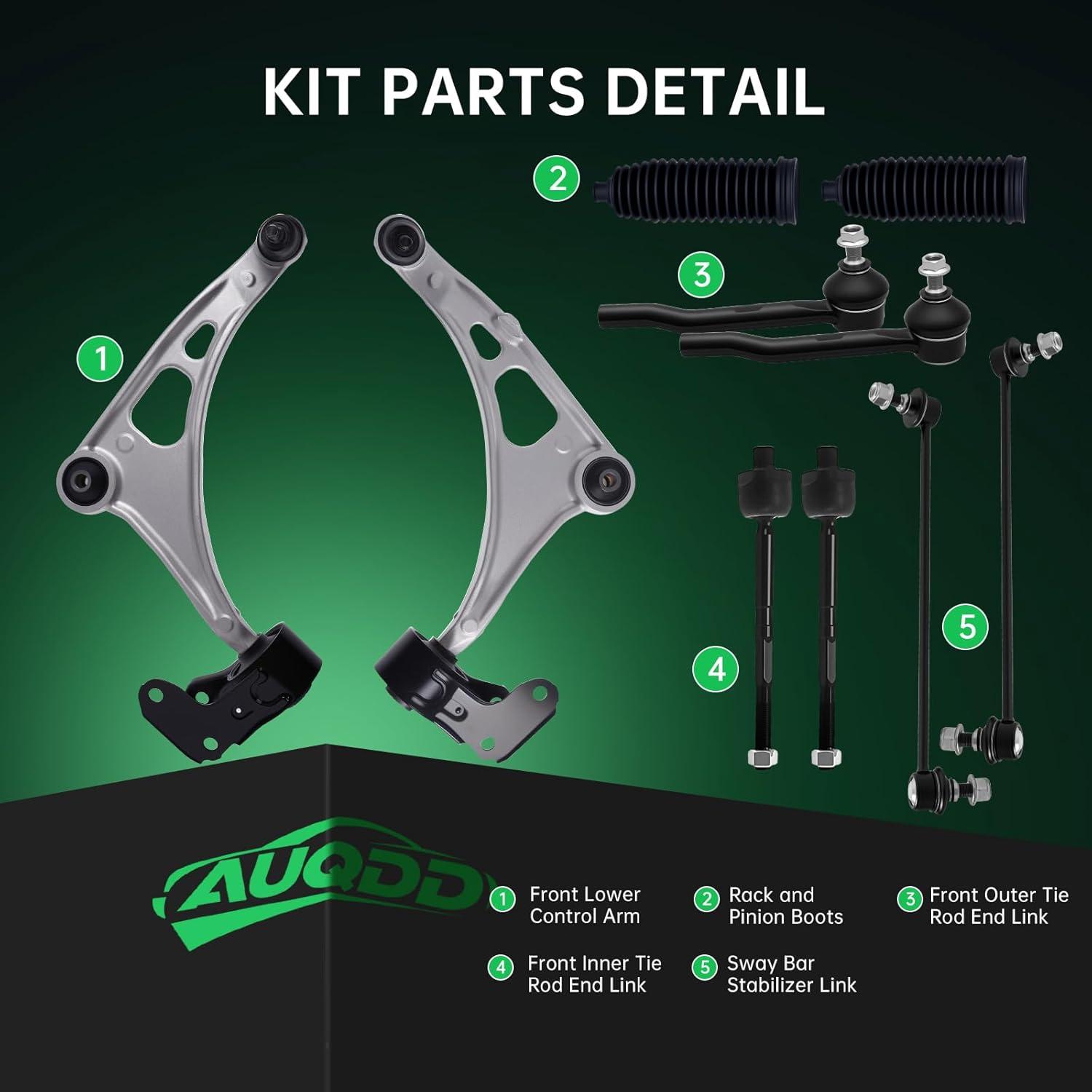 【Suspension Kit Include】 2 x Front Lower Control Arm w/Ball Joint Assembly – ( K623548 + K623549 ) Driver & Passenger Side, 2 x Front Outer Tie Rod End Links – ( ES801204 + ES801205 ), 2 x Front Inner Tie Rod End Links – EV801435, 2 x Front Stabilizer Sway Bar End Links – ( K750834 + K750835 ), 2 x Rack and Pinion Boots