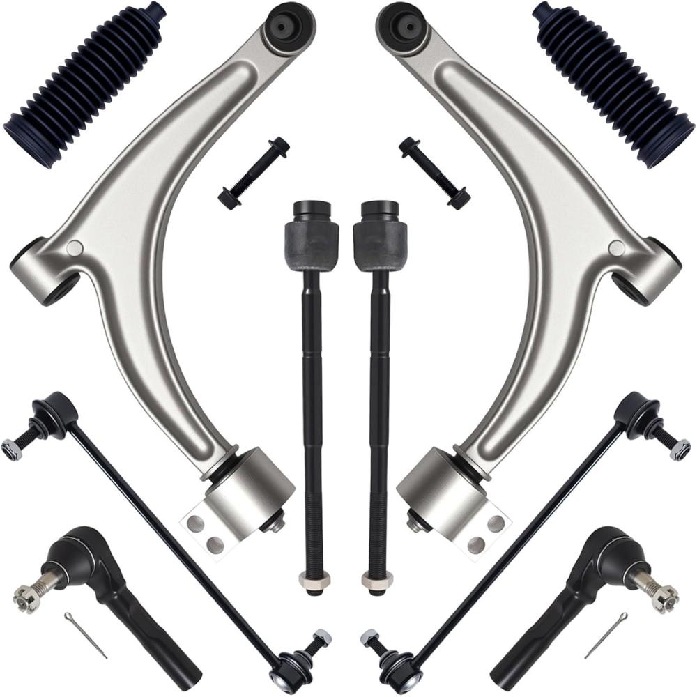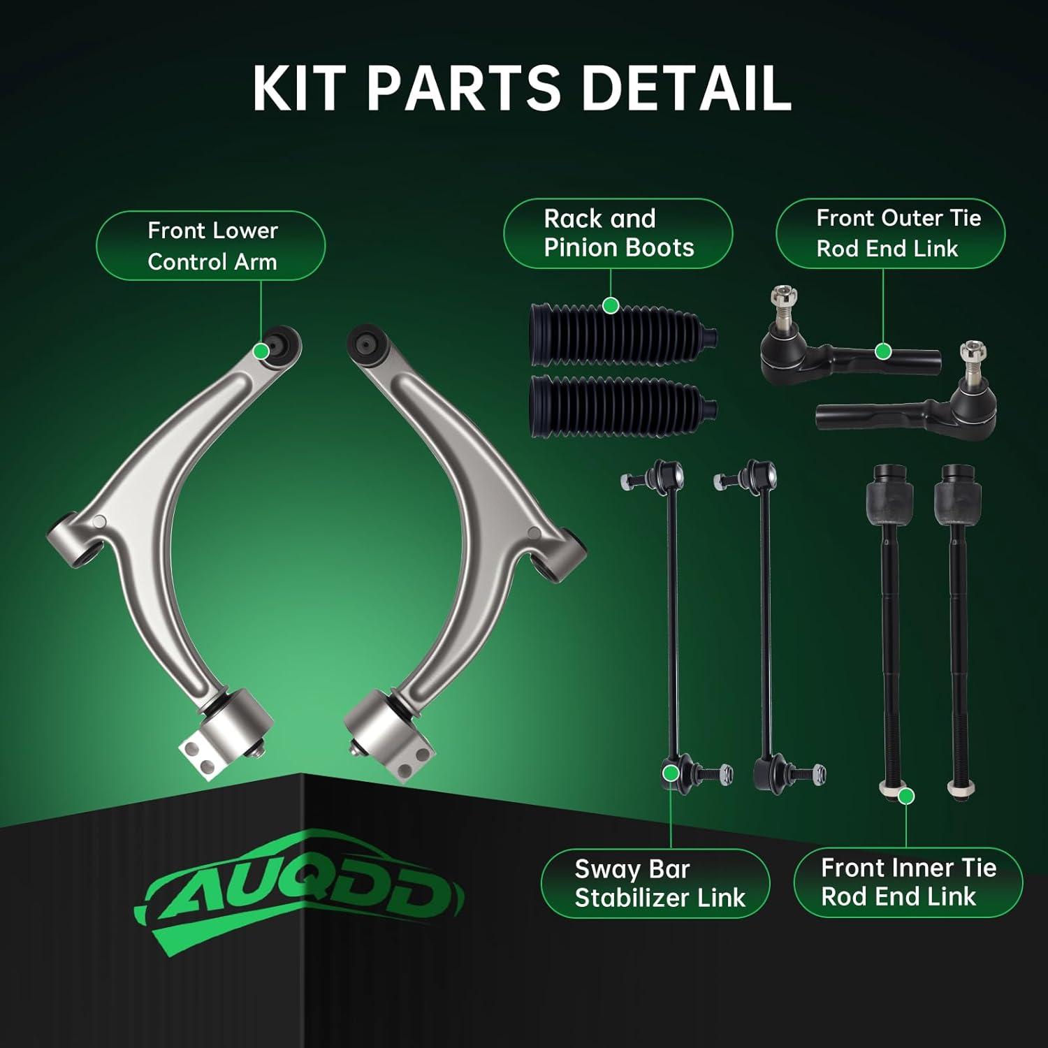 【Suspension Kit Include】 2 x Front Lower Control Arm w/Ball Joint Assembly – ( K620179 + K620180 ) Driver & Passenger Side, 2 x Front Outer Tie Rod End Links – ES800086, 2 x Front Inner Tie Rod End Links – EV80988, 2 x Front Stabilizer Sway Bar End Links – K80252, 2 x Rack and Pinion Boots.