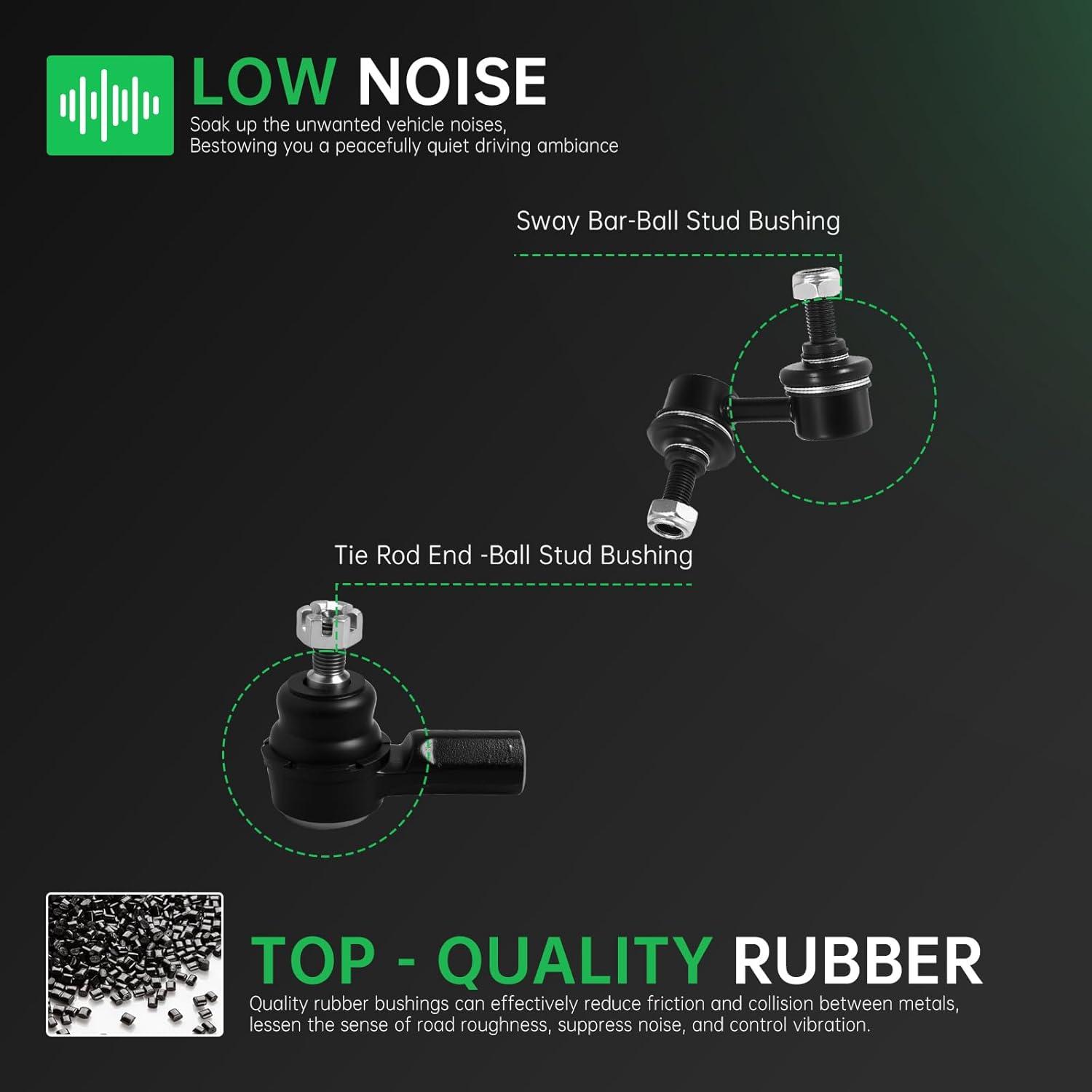 【Suspension Kit Include】 2 x Front Lower Control Arm w/Ball Joint Assembly – ( K620382 + K620383 ) Driver & Passenger Side, 2 x Front Outer Tie Rod End Links – ( ES800373 + ES800374 ), 2 x Front Inner Tie Rod End Links – EV800246, 2 x Front Stabilizer Sway Bar End Links – ( K80768 + K80769 ) , 2 x Rack and Pinion Boots