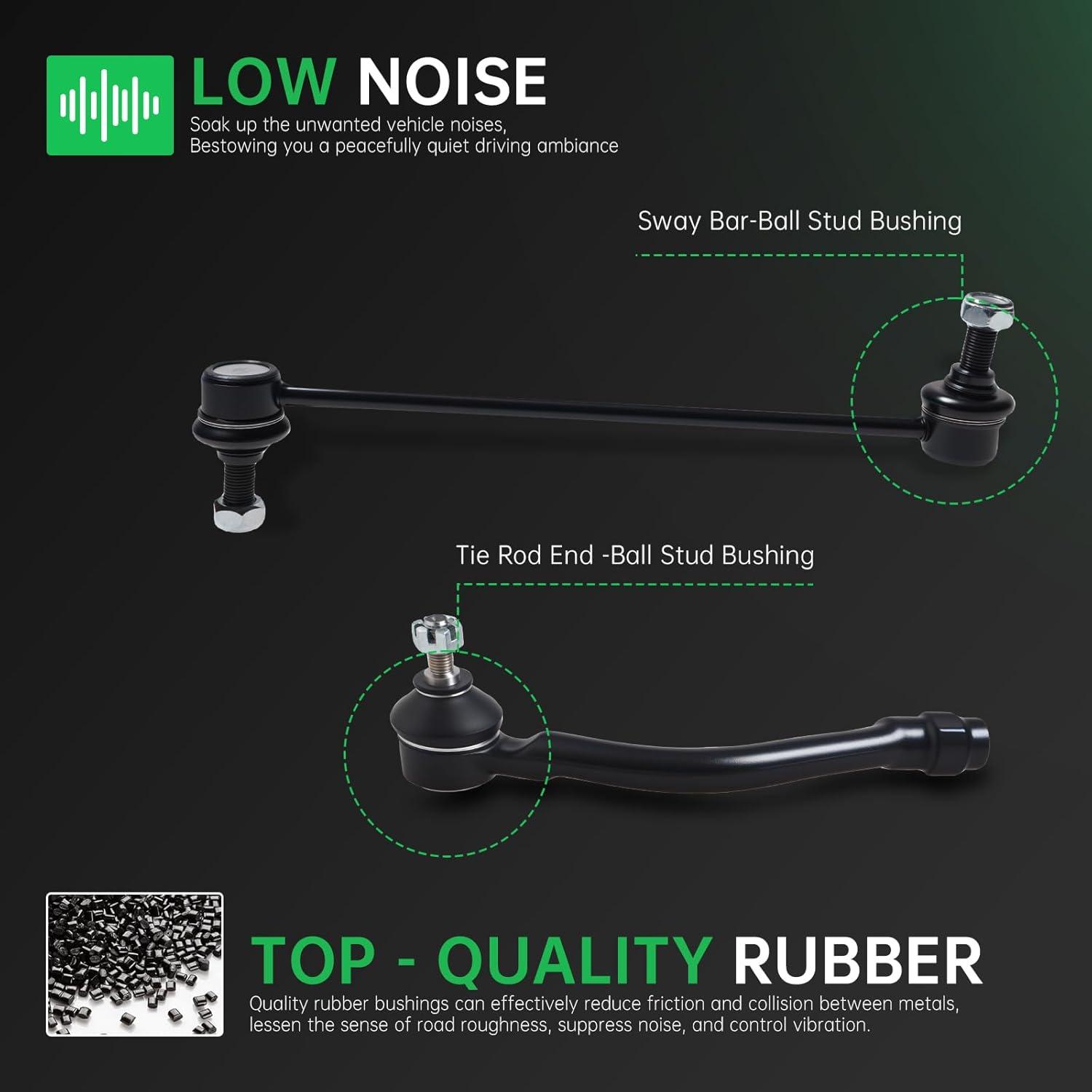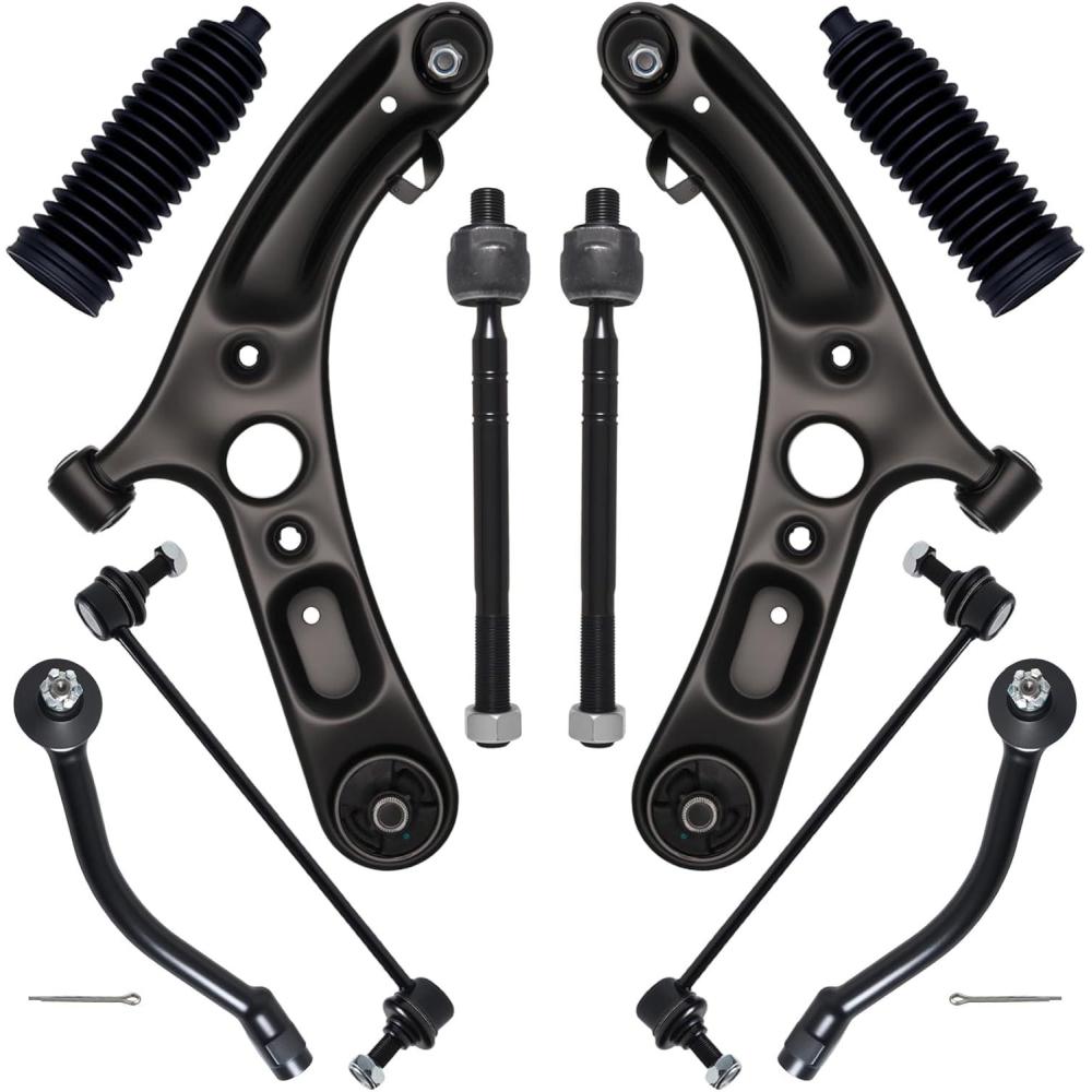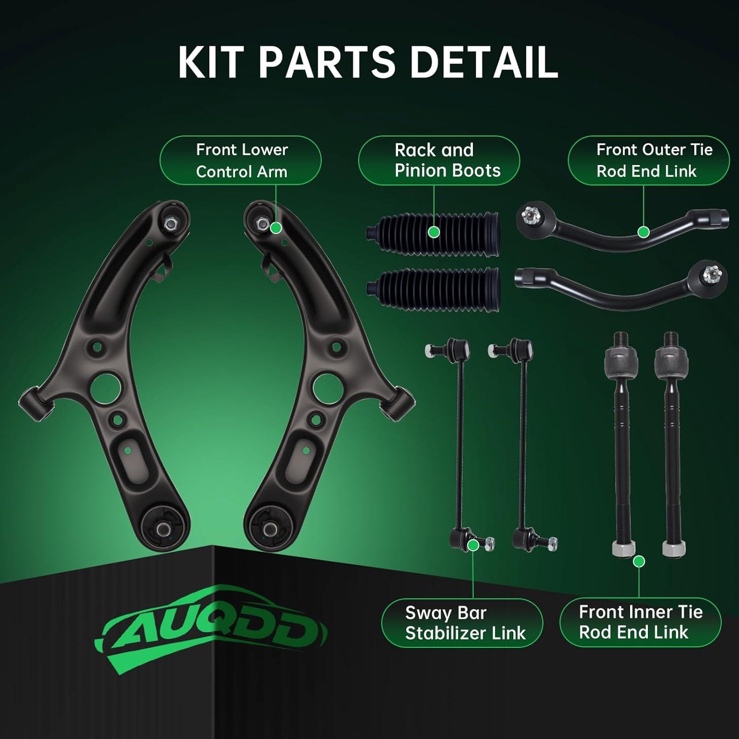 【Suspension Kit Include】 2 x Front Lower Control Arm w/Ball Joint Assembly – ( K622232 + K622646 ) Driver & Passenger Side, 2 x Front Outer Tie Rod End Links – ( ES801074 + ES801075 ), 2 x Front Inner Tie Rod End Links – EV800886 , 2 x Front Stabilizer Sway Bar End Links – K750523,2 x Rack and Pinion Bellow Boots