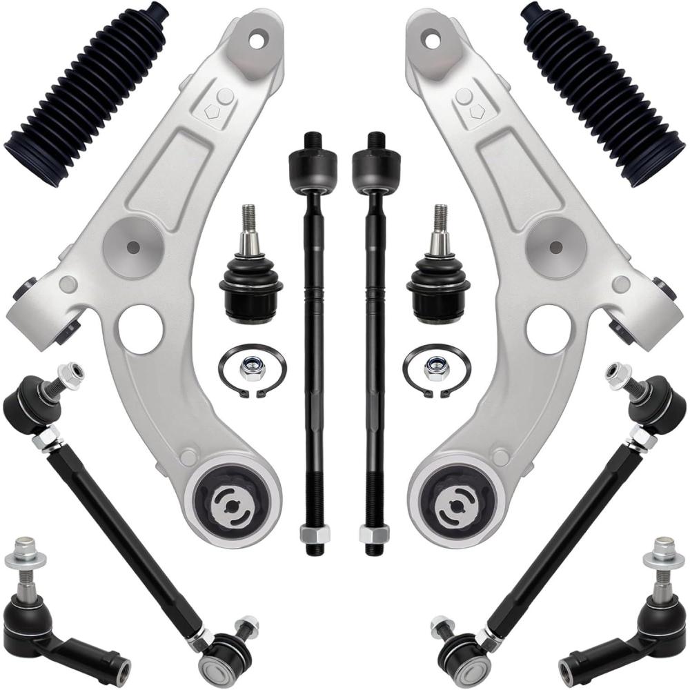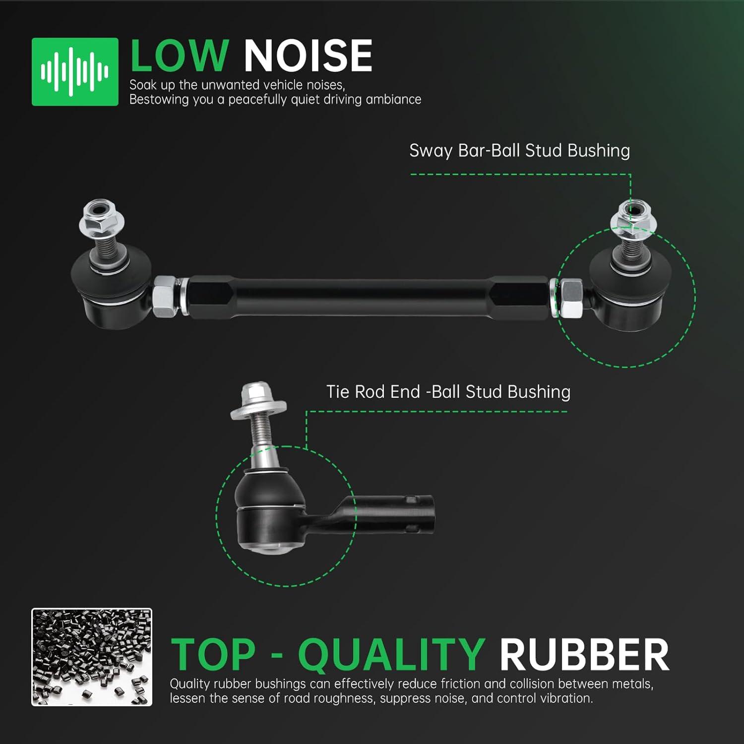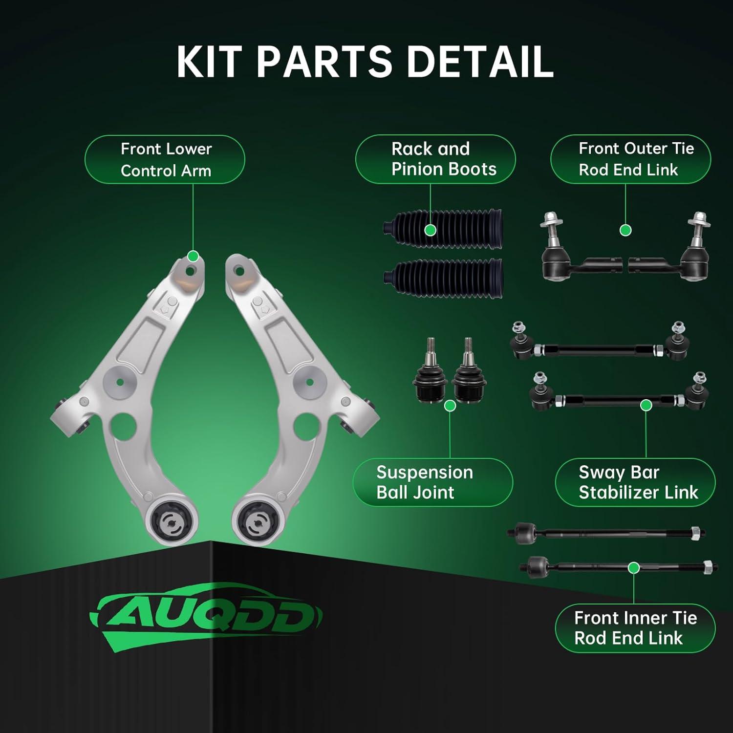 【Suspension Kit Include】 – 2 x Front Lower Control Arms – ( K643179 + K643180 ) Driver & Passenger Side + 2 x Front Outer Tie Rod End Links – ( ES801238 + ES801239 ) + 2 x Front Inner Tie Rod End Links – EV801068 + 2 x Adjustable Front Stabilizer Sway Bar End Links – AJ750704 + 2 x Front Lower Suspension Ball Joints – K500287 + 2 x Rack and Pinion Boots