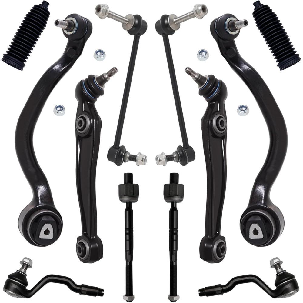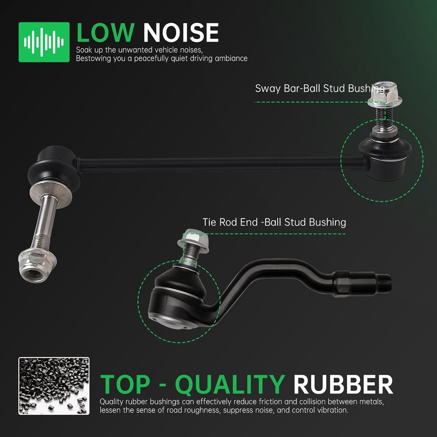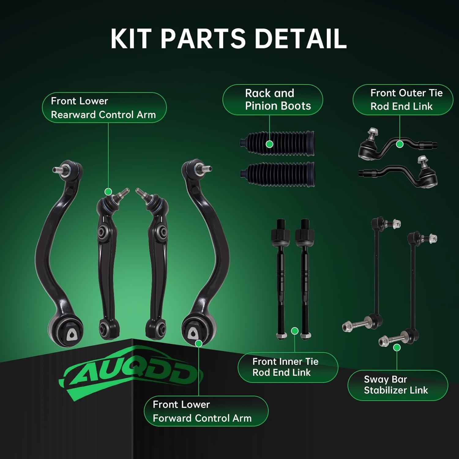 【Suspension Kit Include】 – 2 x Front Lower Forward Control Arm w/Ball Joint Assembly – ( K620798 + K620799 ) Driver & Passenger Side, 2 x Front Lower Rearward Control Arm – ( K620800 + K620801 ), 2 x Front Sway Bar Stabilizer Link – ( K750217 + K750218 ), 2 x Front Inner Tie Rod End – EV800298, 2 x Front Outer Tie Rod End – MS10668, 2 x Rack and Pinion Boots