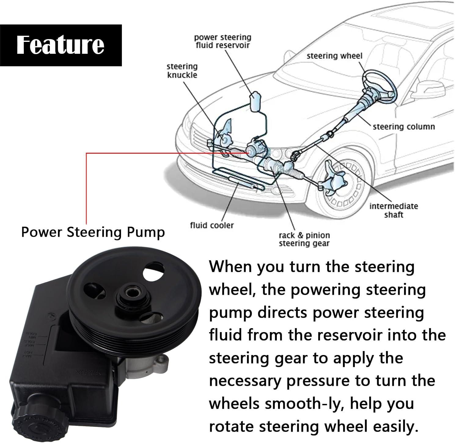 【Function】The power steering pump is used to converting power to the power steering fluid from the reservoir into the steering gear and keeps the wheels running in good conditions. Once you noticed that your vehicle wheels runs unsmoothly, steering wheel slow to respond, stiff steering wheel and make loud noise, then you need to double check the power steering pump and get it replaced if it is defective.
