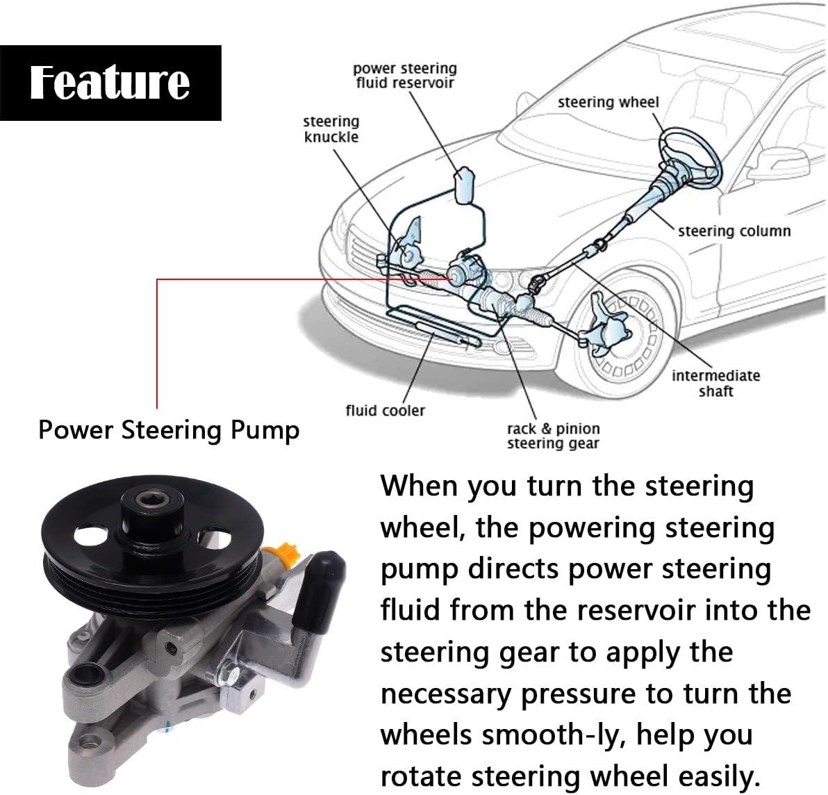 [Function] – The power steering pump is used to converting power to the power steering fluid from the reservoir into the steering gear and keeps the wheels running in good conditions. Once you noticed that your vehicle wheels runs unsmoothly, steering wheel slow to respond, stiff steering wheel and make loud noise, then you need to double check the power steering pump and get it replaced if it is defective.