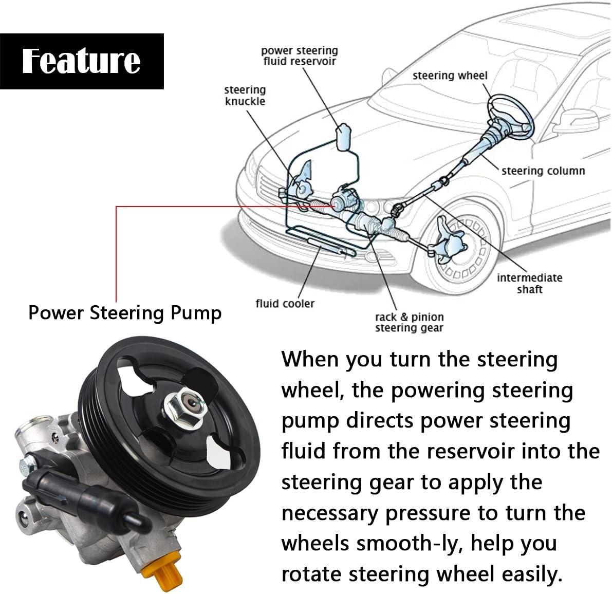 【Function】The power steering pump is used to converting power to the power steering fluid from the reservoir into the steering gear and keeps the wheels running in good conditions. Once you noticed that your vehicle wheels runs unsmoothly, steering wheel slow to respond, stiff steering wheel and make loud noise, then you need to double check the power steering pump and get it replaced if it is defective.