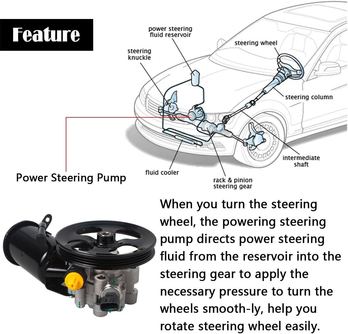 【Function】The power steering pump is used to converting power to the power steering fluid from the reservoir into the steering gear and keeps the wheels running in good conditions. Once you noticed that your vehicle wheels runs unsmoothly, steering wheel slow to respond, stiff steering wheel and make loud noise, then you need to double check the power steering pump and get it replaced if it is defective.